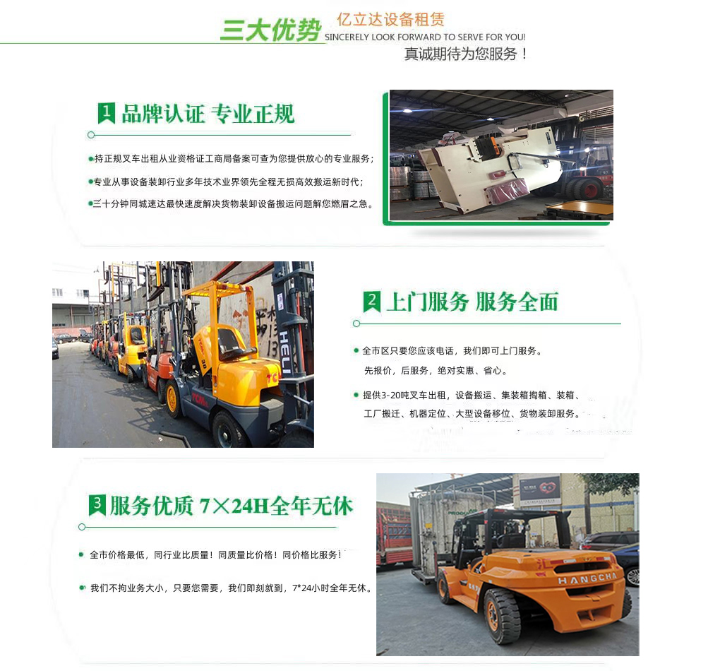 亿立达设备租赁有限公司是工商局准许的天津工业职业学院专业叉车出租公司,公司本着诚信、服务、效率、创新的经营理念,用精湛的技术,真诚的服务,为众多客户提供优质的服务,同时获得信赖与支持。专业提供天津工业职业学院3-20吨叉车出租、叉车租赁、设备搬运、集装箱掏箱装箱、机器移位定位、货物装卸、工厂搬迁、安全可靠,收费透明,价格便宜,随叫随到,24小时上门服务!本公司叉车吊车师傅对各种设备搬运装卸都有深刻探讨和研究。很多的疑难设备搬运,通过我公司的叉车师傅都能迎刃而解。对各种进口设备、国产机器、大型设备搬迁、高难度搬迁、各种精密仪器、医疗设备、科研设备等都能搬运; 提供全市 24 小时上门装卸搬运服务。同时提供厂房搬迁服务。 ...